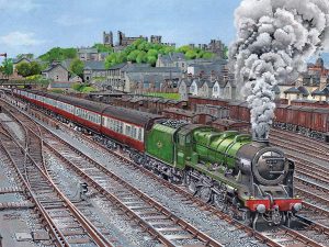 Arthur has been commissioning paintings for various clients for many years, but some are more prestigious than others. The most prestigious came in 1984, when the Queen Mother herself was visiting the Flying Scotsman, and was presented with painting of the locomotive, painted by Arthur.