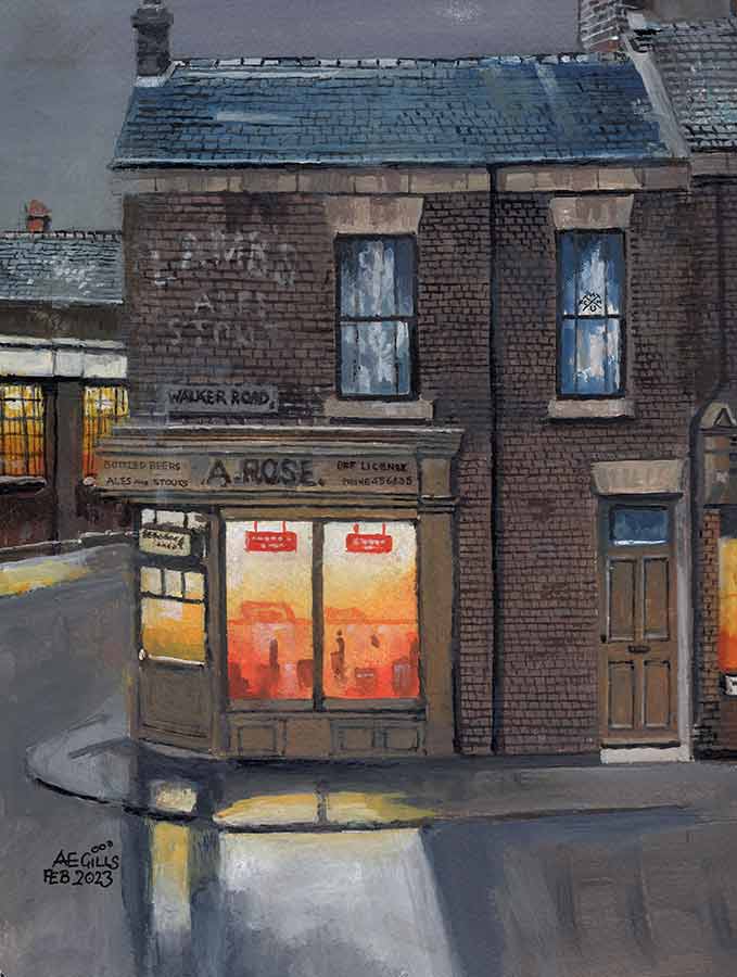 A.Rose Off license on Walker road and the corner of Raby Street. Opposite what is now Saint Peters Social club on the bank down to St Peters Basin. Set sometime in the mid 20th Century.