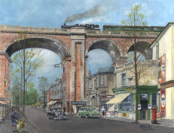 The London Road Viaduct in Brighton and Hove, looking down Preston Road. set sometime in the 1960s.