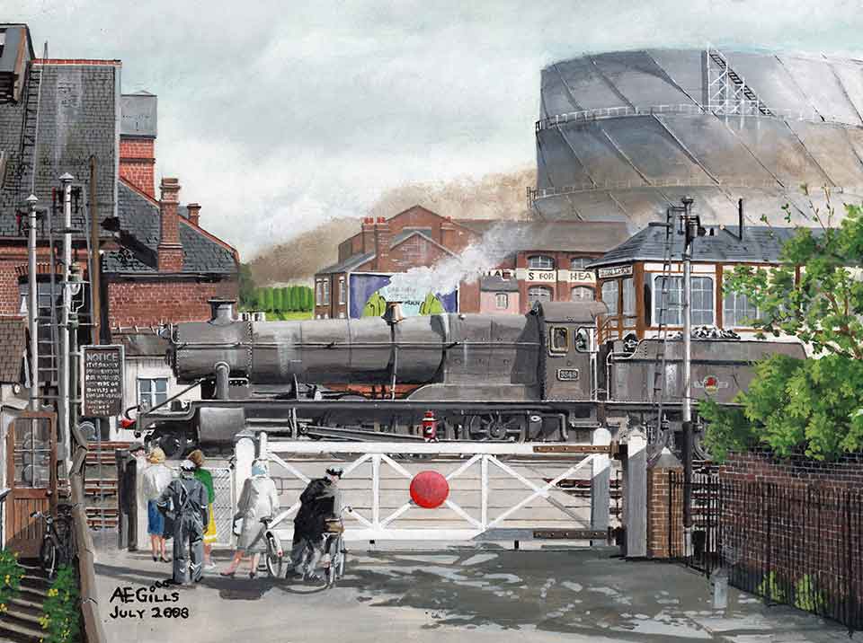 Scene from Gloucester of the Barton Street rail crossing with it’s gantry mounted signal box on the right. The engine is a 4800 Class 2-8-0 freight locomotive 3848.